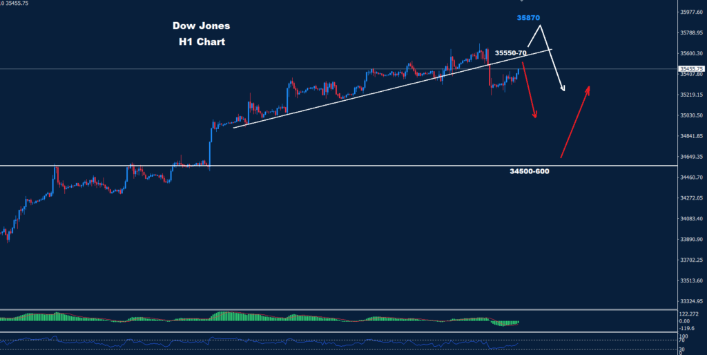 تمكن مؤشر الداو من الوصول إلى منطقة المقاومة 70-35550 يوم الجمعة الماضي حيث تمكن من ضرب بعض التصحيح الهبوطي باتجاه 35350 حتى الآن.