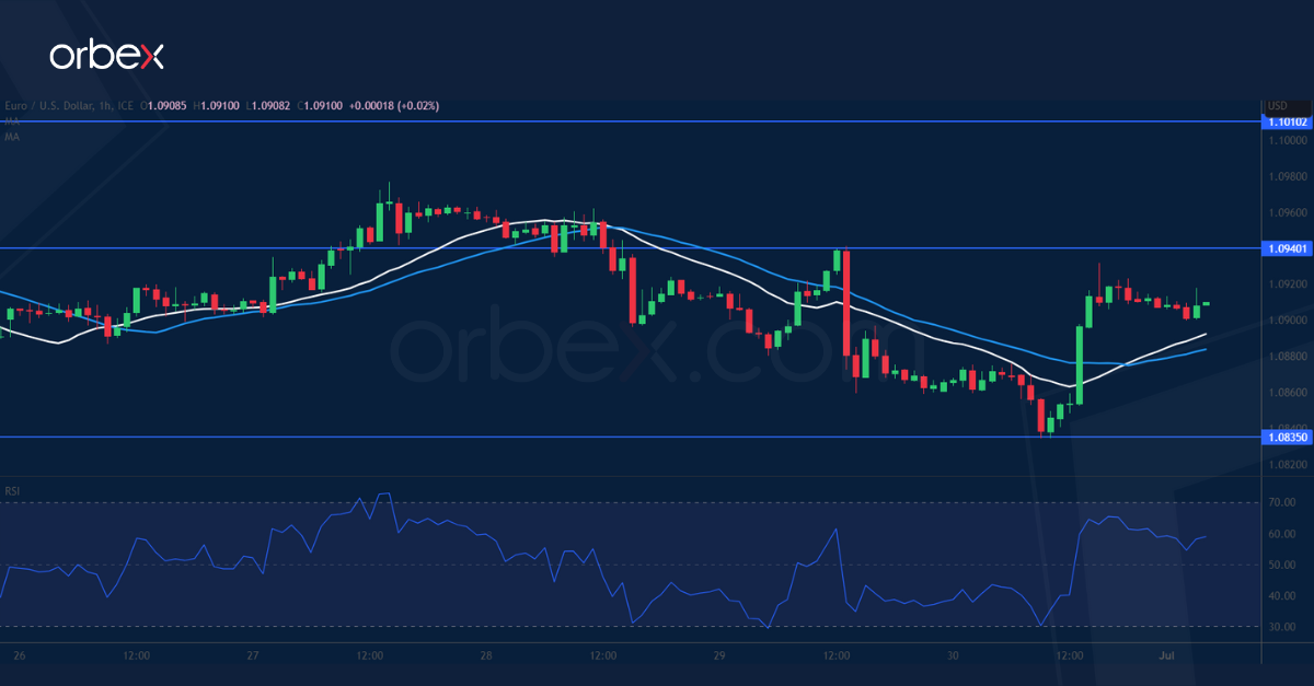 تخلى الدولار الأمريكي عن بعض المكاسب التي حققها لصالح اليورو بعد أن أظهر مؤشر أسعار نفقات الاستهلاك الشخصي تباطؤاً في مايو. وتحول مسار الزوج نحو التصحيح بعد أن دخل منطقة العرض عند ١.١٠١٠ من عمليات البيع القوية التي شهدها الزوج في مايو. وكان الهبوط دون القاع الأخير عند ١.٠٨٥٠ كفيلًا بإخراج المشترين المترددين، ومن ثم تبعه الارتداد من ١.٠٨٣٥ بجانب المتوسط المتحرك البسيط لمدة ٣٠ يوماً والذي قد يمنح المشترين فرصة ثانية. ويعد ١.٠٩٤٠ هو المستوى الأول المرشح للاختراق، وسيؤدي اختراقه إلى استمرار الاتجاه الصاعد وتجاوز الزوج المستوى ١.١٠١٠، ليؤكد تقاطع المتوسط المتحرك الصاعد على الرسم البياني اليومي في هذه المرحلة.