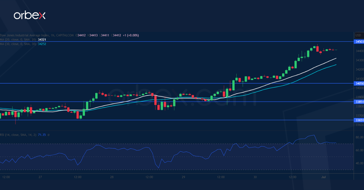 ارتفع مؤشر “داو جونز ٣٠” بعد أن أظهرت بيانات التضخم في الولايات المتحدة علامات التباطؤ. وبعد توقف قصير دون ٣٤٠٠٠، ساعدت القفزة أعلى هذا المستوى النفسي المشترين على استعادة السيطرة على الاتجاه قصير المدى. وتعد قمة يونيو ٣٤٥٠٠ مقاومة رئيسية حيث يمكن للمشترين جني بعض أرباحهم. وقد يمهد الاختراق الإيجابي الطريق لاتساع نطاق الارتفاع إلى أعلى مستوى للمؤشر في ١٤ شهراً عند ٣٥٥٠٠. هذا ويعتبر ٣٤٠٥٠ هو الدعم الأقرب حيث يتوغل مؤشر القوة النسبية في منطقة ذروة الشراء، وقد يرى المشترون من التراجع المحدود فرصة للشراء.