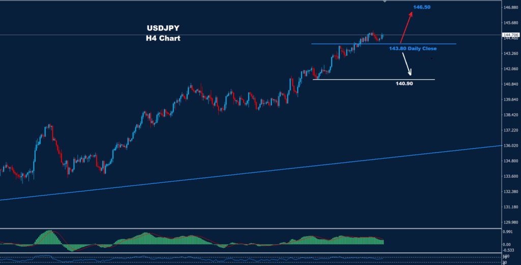 كما نصحنا في الأسابيع القليلة الماضية، تمكن الدولار الأمريكي مقابل الين الياباني من الحفاظ على الموجة المتقدمة، حيث تمكن من تحقيق الهدف الأول والثاني حول 144.60.