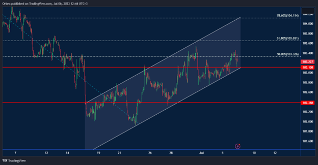 وتتحول النظرة إلى البيع في حال كسر الحد السفلي للقناة السعرية قرابة المستوى 102.90 لتتحول النظرة إلى البيع باستهداف المستوى 102.40.