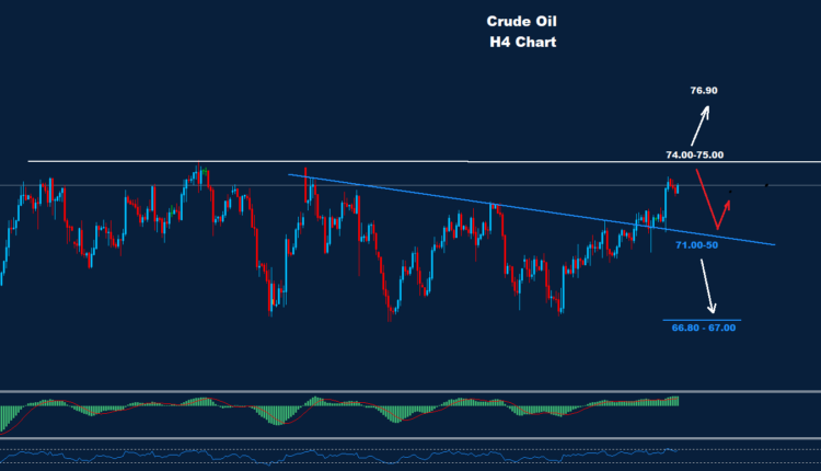 تمكن النفط الخام من التوجه إلى مزيد من الحركة المتقدمة كما نصحنا الأسبوع الماضي، حيث تمكن من الوصول إلى المنطقة المستهدفة 74.00-75.00 أمس.