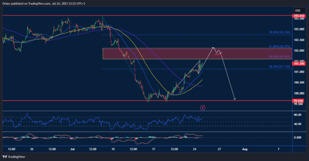 من الناحية الفنية، من المتوقع استمرار الحركة التصحيحية الصاعدة للدولار لاختبار مستوى المقاومة 102.00 وفي حال فشل مؤشر الدولار في اختراق المستوى 102.75 فمن المتوقع معاودة الهبوط مرة أخرى إلى المستوى 100 ويليه المستوى 99.65.