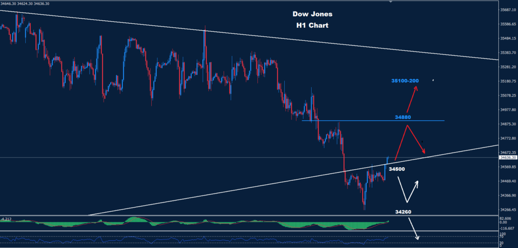 تمكن مؤشر داو جونز في الساعة الماضية من الارتداد فوق المقاومة 600-34500 بينما لا يزال السوق بحاجة لرؤية افتتاح جلسة التداول الامريكية اليوم