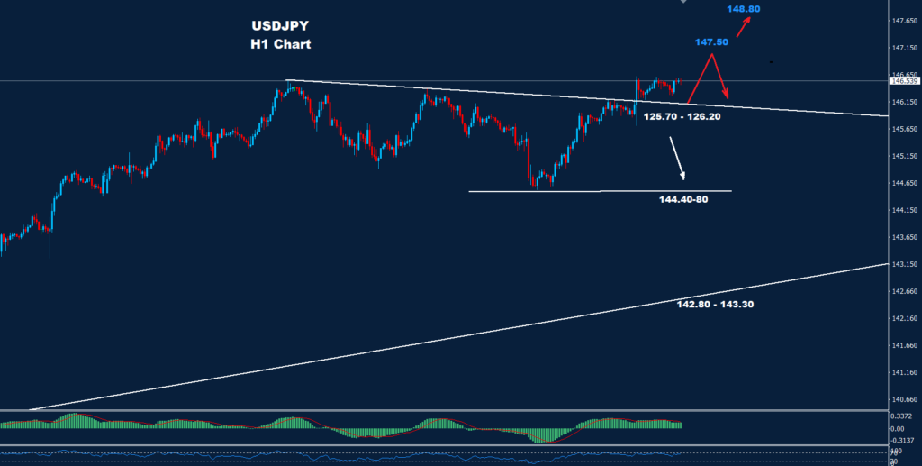 تمكن الدولار الأميركي مقابل الين الياباني من التقدم فوق 146.25 حيث نصحنا الأسبوع الماضي أن المزيد من التقدم فوق هذا المستوى قد يضرب السوق.