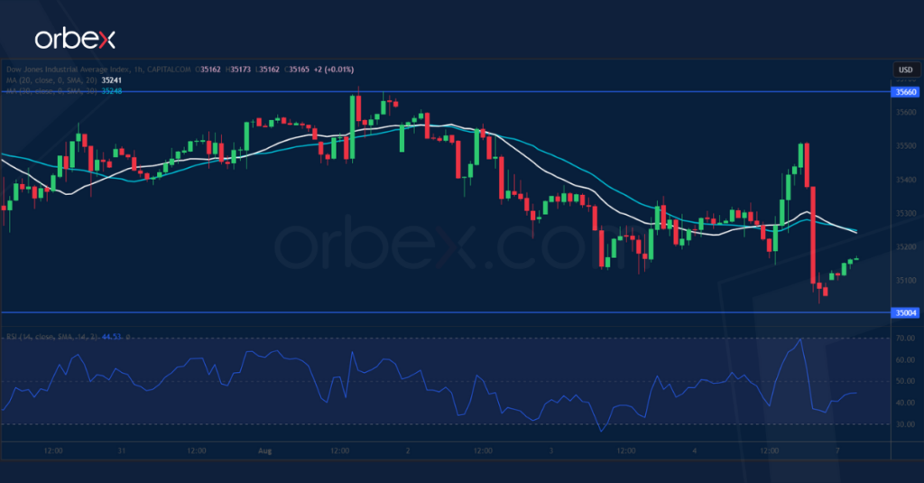 تراجع مؤشر داو جونز 30 بعد ارتفاع مؤشر متوسط الأجور الأمريكي، ما أثار المخاوف حيال تبني الاحتياطي الفيدرالي مزيد من التشديد النقدي. وتحوّل المزاج العام إلى الحذر عند مستوى 35660، حيث دّل مؤشر القوة النسبية في الرسم البياني اليومي على حالة من الشراء المفرط، ما يشير إلى احتمالية توقف هذا الاتجاه بعد ثلاثة أسابيع من الارتفاع المتواصل.