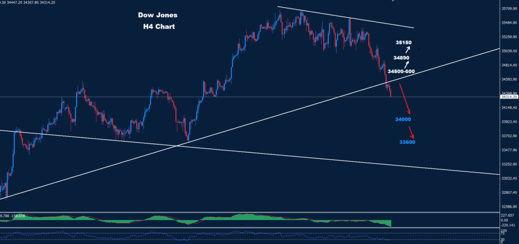 تمكن مؤشر الداو أمس من اختراق الدعم 600-34500 مما قد يدفع باتجاه هبوطي جديد كما نصحنا من قبل