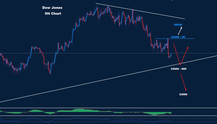 كما نرى على الرسم البياني، قام السوق ببناء مقاومة حول منطقة 90-34650، حيث أنه طالما أن السوق يتداول تحتها، فقد يكون من المتوقع حدوث انخفاض إضافي لاختبار منطقة 800-33600 والذي بدوره قد ينشط بعض التصحيح الارتدادي.
