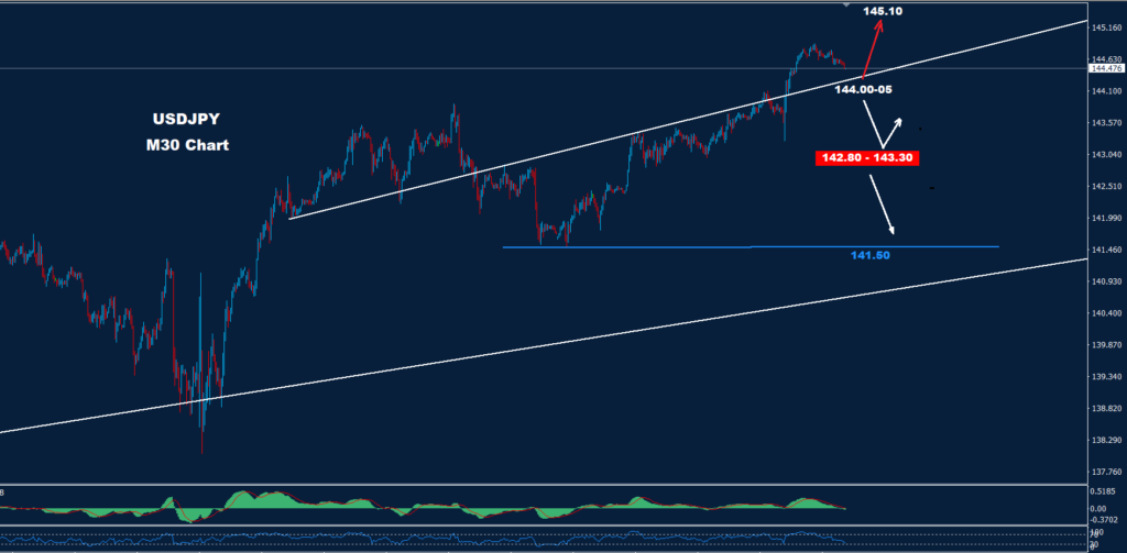 تحت 144.00 المزيد من التصحيح الهبوطي قد يضرب السوق حيث توجد منطقة الدعم داخل 142.80 – 143.30 والتي بدورها قد تدفع إلى بعض التصحيح الارتدادي
