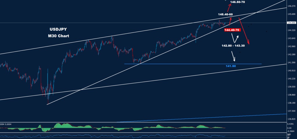 لا يزال الدولار الأميركي مقابل الين الياباني متمسكاً بالموجة الصاعدة كما نرى على الرسم البياني للمدى اليومي يبدو أن السوق يبني نموذج الوتد الصاعد مع مقاومة حول 60-145.40 مما قد يؤدي إلى تصحيح هبوطي أكبر نحو منطقة 142.80-143.30