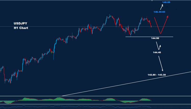 تحت 144.90 من المتوقع المزيد من الانخفاض حيث يقع الدعم عند 144.40 و142.80-143.30
