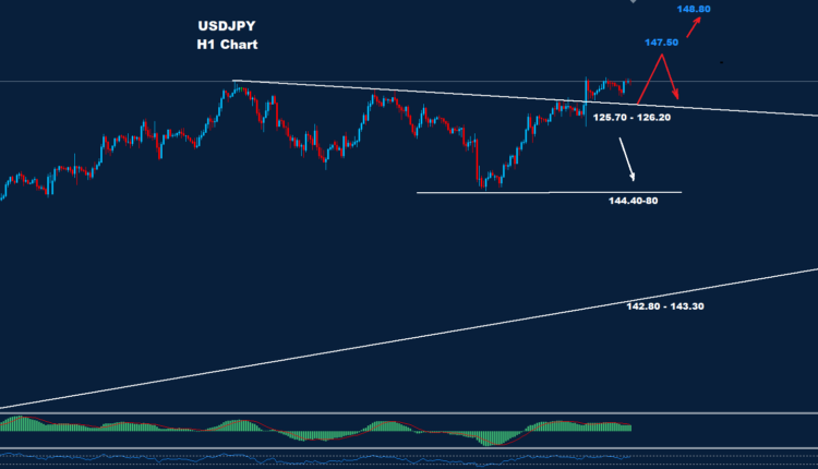 كما نرى على الرسم البياني، يواجه السوق الآن منطقة دعم حول 145.70-146.20 حيث طالما أن السوق يتداول فوقها فإن الموجة المتقدمة قد تستمر نحو 147.50.