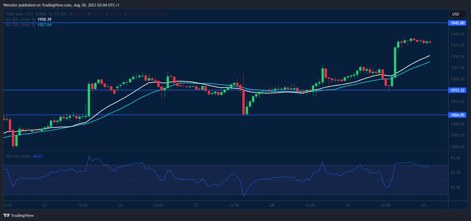 سجل سعر الذهب ارتفاعاً بعدما تسبب ضعف فرص العمل في الولايات المتحدة بانخفاض مؤشر الدولار. وقد دفع الإغلاق أعلى مستوى الدعم اليومي السابق ١٩٢٠ بعض البائعين إلى تغطية مراكزهم، وهذا السلوك يمكن أن يكون إشارة لحركة ارتداد محتمة آخذة في التبلور. وقد لاقى الانخفاض المؤقت دعماً عند قاعدة الزخم الصاعد المتمثلة في المستوى ١٩٠٤، ويشير الارتفاع لمستوى أعلى إلى تزايد الضغط الإيجابي. ويعد السعر ١٩٤٥ هو المستوى التالي المهم، والذي من شأن تجاوزه أن يفضي إلى انتعاش مستدام نحو القمة التي سجلها الذهب عند ١٩٨٠. وفي حال شهد الذهب تراجعاً مقابل الدولار الأمريكي نتيجة وصول مؤشر القوة النسبية لمنطقة ذروة الشراء من جديد، سيمثل المستوى ١٩١٥ أولى مستويات الدعم.