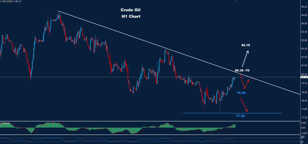 تمكن النفط الخام من الارتداد من مستوى الدعم 77.60 كما نصحنا أمس بينما يقترب من مقاومة الترند المستهدف والتي تقع الآن حول منطقة 70-80.30 .