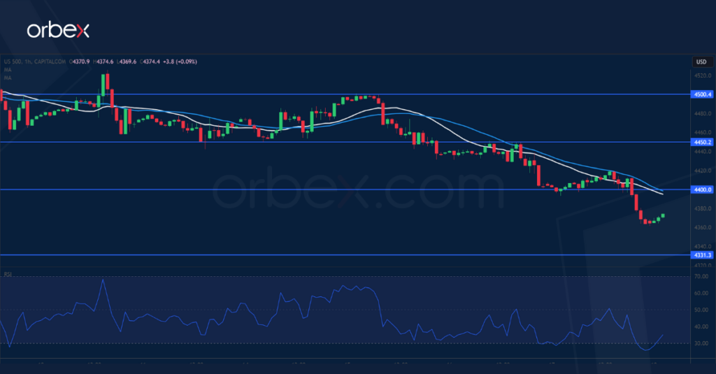 ومع هبوط مؤشر القوة النسبية (RSI) إلى منطقة التشبع البيعي، يُعتبر المستوى 4330 هو المستوى الذي يمكن النظر فيه لتحقيق استقرار السعر أو قد يتبعه تصفية أوسع تدفع السعر صوب مستوى 4200. أما المستوى 4400 فقد أصبح مستوى مقاومة جديد ليواجهه السعر مستقبلاً.