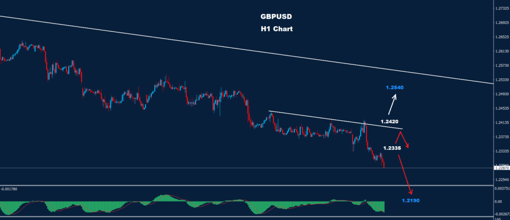 كما نرى على الرسم البياني، يواجه السوق الآن أول مقاومة للمدى اليومي حول 1.2335، بينما لا تزال المقاومة الثانية حول 45-1.2420 بينما طالما استمر السوق في الحفاظ على التداولات تحت إحدى تلك المقاومات ، فقد يستمر ضغط الاتجاه الهبوطي لمزيد من الانخفاض نحو 1.2190 فما دون.