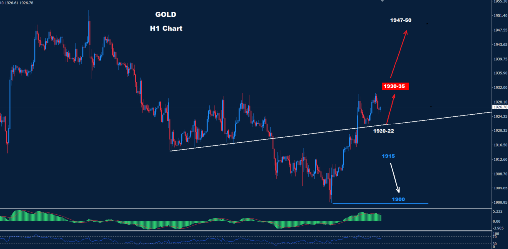 تمكن الذهب من الحفاظ على تداولاته فوق مستوى الدعم 1900 حيث تمكن من تحقيق الهدف 22-1920 و 35-1930 كما نصحنا الأسبوع الماضي.