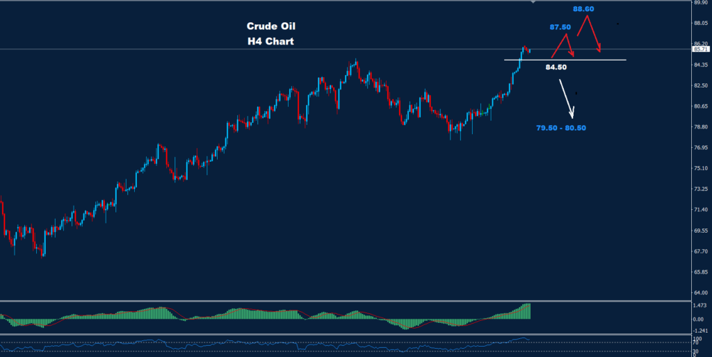 تمكن النفط الخام من تجاوز مستوى المقاومة 84.90 حيث توقعنا الأسبوع الماضي أن المزيد من التقدم فوق هذا المستوى قد يضرب السوق.
