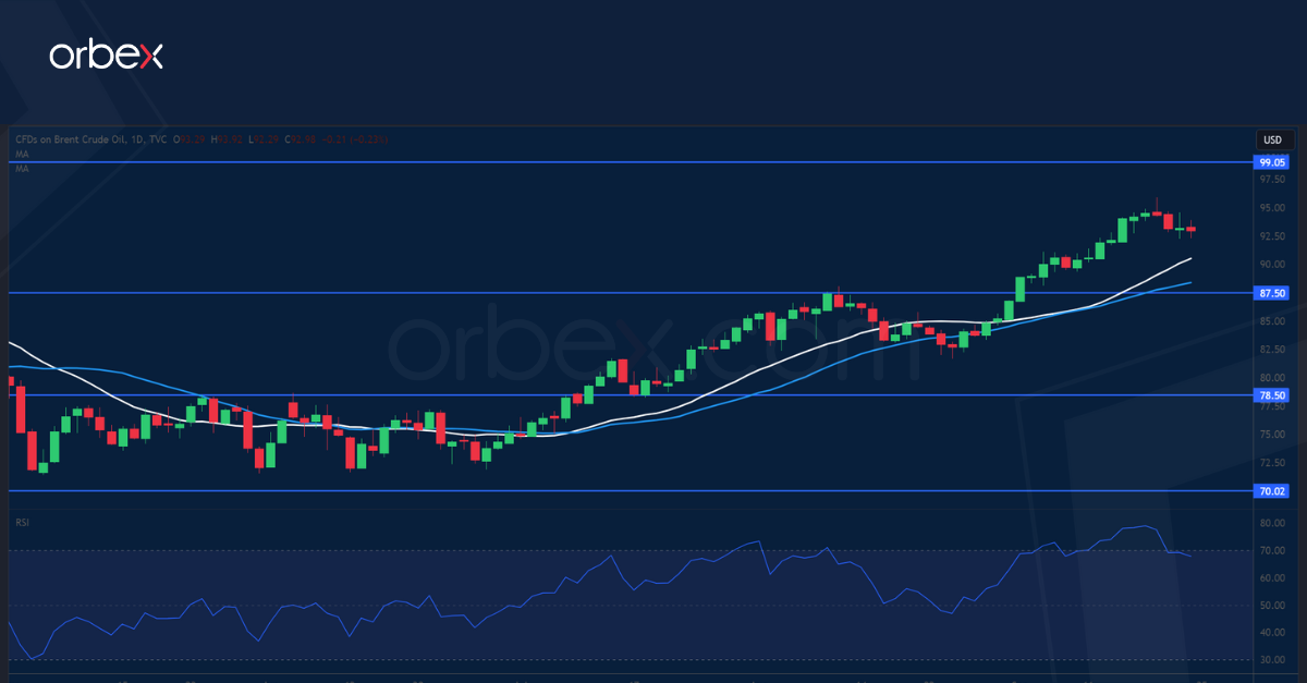 استقر خام برنت قرب أعلى مستوى له في ١٠ أشهر بينما ينصب تركيز المتداولين أكثر على قيود العرض. وارتفعت أسعار النفط بعد تحول المعنويات من الجانب السلبي الذي خلفه القلق بشأن ضعف الطلب إلى الجانب الإيجابي مع تقلص المعروض. ومن شأن قرار تعليق رفع الفائدة الجماعي الذي اتخذته البنوك المركزية الكبرى أن يحد المخاوف بشأن دخول اقتصاداتها في ركود عميق. وفيما يتوقع المتداولون تمديد قرارات خفض الإنتاج من قبل منظمة “أوبك+”، قررت روسيا حظر صادرات الوقود مؤقتاً بهدف معالجة نقص الإمداد واستقرار السوق المحلية، وهو ما قد يزيد من سعر السلعة. وقد يبحث خام برنت عن الدعم أعلى ٨٧.٥٠، مع احتمالية استهداف المستوى ٩٩.٠٠.