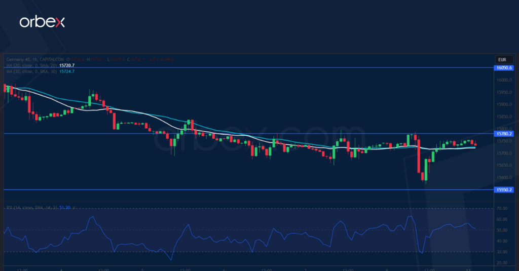 يواجه مؤشر الداكس صعوبة في الارتفاع إثر احتمالية إلتزام البنك المركزي الأوروبي في رفع أسعار الفائدة. ويشير توقف الارتداد الأخير عند قمة الارتفاع السابق ١٦٠٥٠، إلى أن البائعين ما زالوا يسيطرون على الاتجاه. ويمثل المستوى ١٥٥٥٠، حيث بداية هذا الارتداد، دعماً جوهرياً يتوجب الحفاظ عليه لإبقاء المؤشر صامداً، وإلا فمن شأن كسره أن يجبر أغلبية المشترين على الانسحاب، وهو ما قد يفضي لحركة تصحيح أعمق نحو ١٥٢٠٠. هذا ويعتبر المستوى ١٥٧٨٠ هو أول مقاومة يجب تجاوزها لتخفيف الضغط السلبي المتزايد. ومن ثم سيكون المستوى ١٦٠٥٠ مجدداً هو الفيصل بين تعافي المؤشر، أو تجدد عمليات البيع.