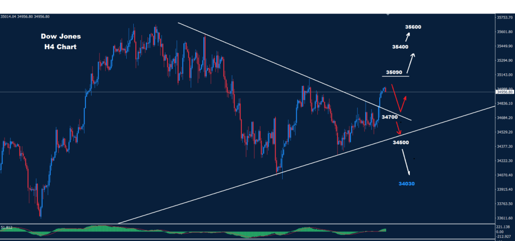 فوق 35090، من المتوقع حدوث المزيد من التقدم نحو 35400 وربما 35600.