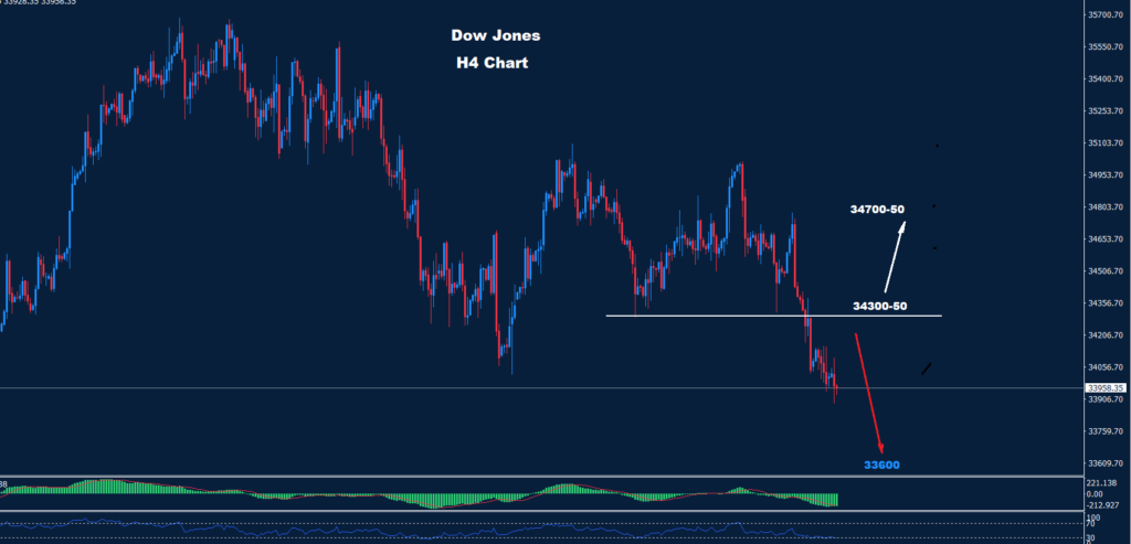 كما نرى على الرسم البياني وطالما استمر السوق في الحفاظ على التداولات تحت 34350 فإن ضغط الاتجاه الهبوطي سيستمر نحو الدعم عند 33600.