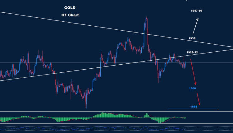 يواجه الذهب بعض الضغوط الهبوطية في السوق، حيث تقع أول مقاومة حول الفترة 1928-1932، وطالما أن السوق يتداول تحتها فمن المتوقع حدوث المزيد من الانخفاض نحو 1900 و1885.