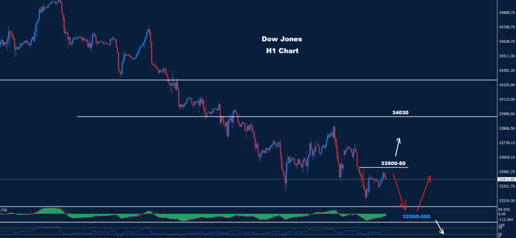 تمكن مؤشر داو جونز من الاحتفاظ بالتداولات تحت مستوى المقاومة 50-33500، حيث تمكن من استئناف الانخفاض هذا الأسبوع بينما تمكن من الوصول إلى مستوى منخفض حول 32820 ليقترب من الهدف 600-32500.