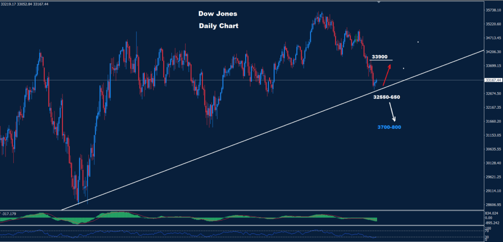 كما نرى على الرسم البياني السابق وطالما استمر السوق في الحفاظ على التداولات فوق ترند الدعم 32820، فقد تستمر الموجة المتقدمة حيث قد تحافظ المقاومة 33900 على ضغط الاتجاه الهبوطي لانخفاض آخر.