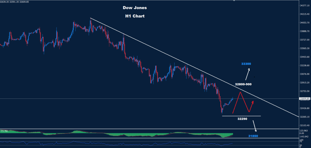كما نرى على الرسم البياني، يواجه السوق دعماً حول 32290 بينما يواجه مستوى مقاومة حول 900-32800 مما قد يخلق منطقة تداول.