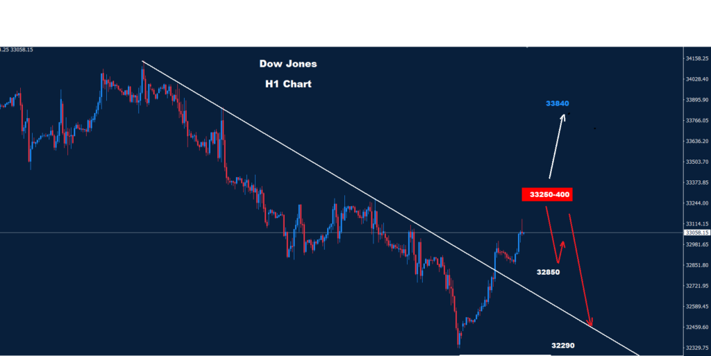 يواجه مؤشر داو جونز مقاومة على المدى القصير حول منطقة 400-33250، حيث طالما أن السوق يتداول تحته فإن موجة الاتجاه الهبوطي لا تزال مستمرة نحو منطقة 32000 وما دونها.