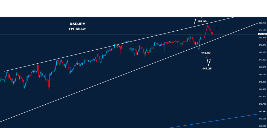 فوق 150.75 من المتوقع المزيد من التقدم حيث قد تدفع المقاومة 95-151.75 لبعض التصحيح الهبوطي.