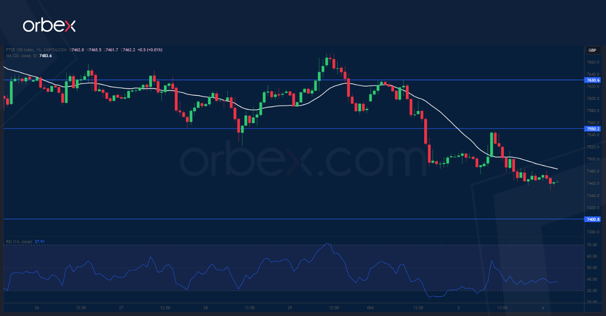تؤثر أسعار السلع الأساسية الضعيفة سلباً على مؤشر “فوتسي ١٠٠” مع استمرار بقاء مستوى الإقبال العالمي على المخاطرة ضعيفاً قبيل صدور بيانات الوظائف الأمريكية. ويواصل المؤشر البحث عن الدعم في منطقة الطلب اليومي المحصورة بين ٧٤٠٠ و٧٥٠٠  والذي يعد جوهرياً للإبقاء على مسيرة ارتفاع الشهر الماضي قائمة. وقد اجتذبت حالة ذروة البيع لمؤشر القوة النسبية بعض الراغبين في الشراء، وربما يكونوا من البائعين على المدى القصير الذين جنوا بعض الأرباح. وستبقى المعنويات حذرة ما لم يتمكن المشترين من تجاوز مستوى ٧٥٥٠، ثم ٧٦٣٠. في المقابل، يتعين صمود الدعم ٧٤٠٠ للحيلولة دون حدوث انعكاس سلبي على المدى المتوسط.