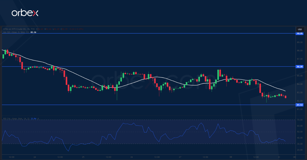 يتراجع خام غرب تكساس الوسيط رغم استمرار الصراع في غزة والذي يبدو أنه لا يؤثر بشكل قوي على إمدادات النفط في الوقت الحالي. ويظهر الرسم البياني اليومي تشكيل السلعة لمثلث توطيد بعد وصوله لأعلى مستوى في ١٠ أشهر. وعلى ما يبدو أن المستوى النفسي ٩٠.٠٠ يشكل مقاومة صعبة، وهو ما يشير إلى وجود فرص أكثر للتداول داخل نطاق سعري محدد. هذا ويمثل السعر ٨١.٥٠ منطقة طلب رئيسية يتعين صمودها للحفاظ على أحدث ارتداد قائماً، ذلك أن فشلها في الصمود سيفضي إلى جولة جديدة من عمليات البيع يستهدف معها المستوى ٧٨.٠٠. أما على الجهة المقابلة، فإن المستوى ٨٦.٠٠ تعد هي أول مقاومة يتعين تجاوزها.