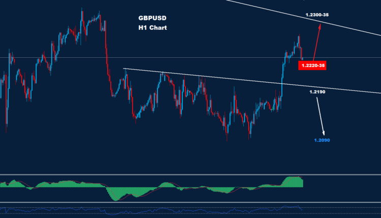 كما نرى على الرسم البياني وطالما يتداول السوق فوق الدعم 35-1.2220 فإن الموجة المتقدمة قد تستمر حيث تقع المقاومة عند 1.2335.