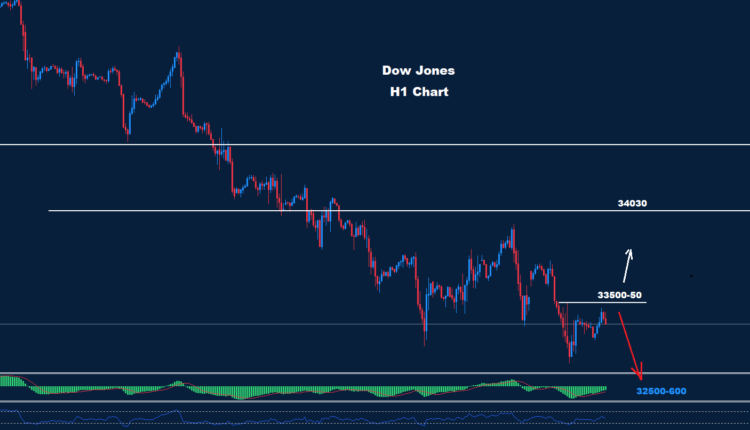 تمكن مؤشر داو جونز من الاحتفاظ بالتداولات تحت المقاومة 34030 حيث تمكن من استئناف الانخفاض هذا الأسبوع نحو الهدف 33300.