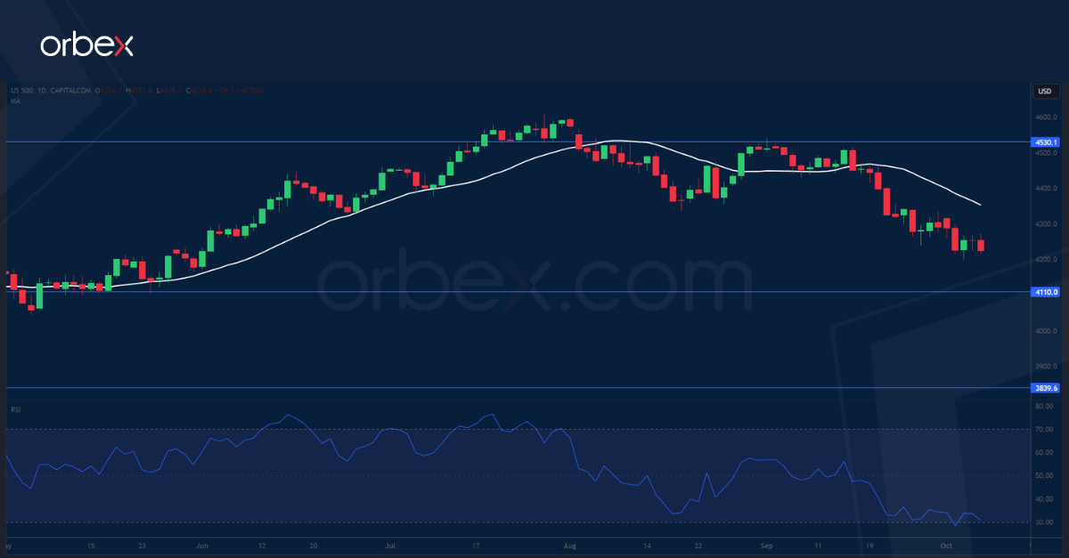 يتراجع مؤشر “ستاندرد آند پورز ٥٠٠” على خلفية صمود الاقتصاد الأمريكي والذي يترجم إلى عدم تخفيض أسعار الفائدة. وقد يحتاج المستثمرين إلى تعديل توقعاتهم بعد تغيير موقف مجلس الاحتياطي الفيدرالي واستيعاب أن أسعار الفائدة ستبقي مرتفعة لفترة أطول، وأن يكونوا حذرين في توقعاتهم بشأن اتجاه معدلات الفائدة في المستقبل. وفيما يبحث مشتري المؤشر عن تأكيد أو ضمان للمحافظة على مراكزهم في السوق في ظل ارتفاع حديث في عوائد السندات، ورغم أن تأكيد صناع السياسات على ضرورة الحفاظ على معدلات الفائدة ثابتة لا يساعد كثيراً، فإن الاعتقاد المرتبط بوجود هبوط اقتصادي سلس قد يجعل الأصول عالية المخاطر جذابة بما فيه الكفاية خلال موسم الأرباح القادم. وبينما يتجه المؤشر إلى ٤١١٠، يمثل ٤٥٣٠ مقاومة رئيسية أمام ارتفاعه.