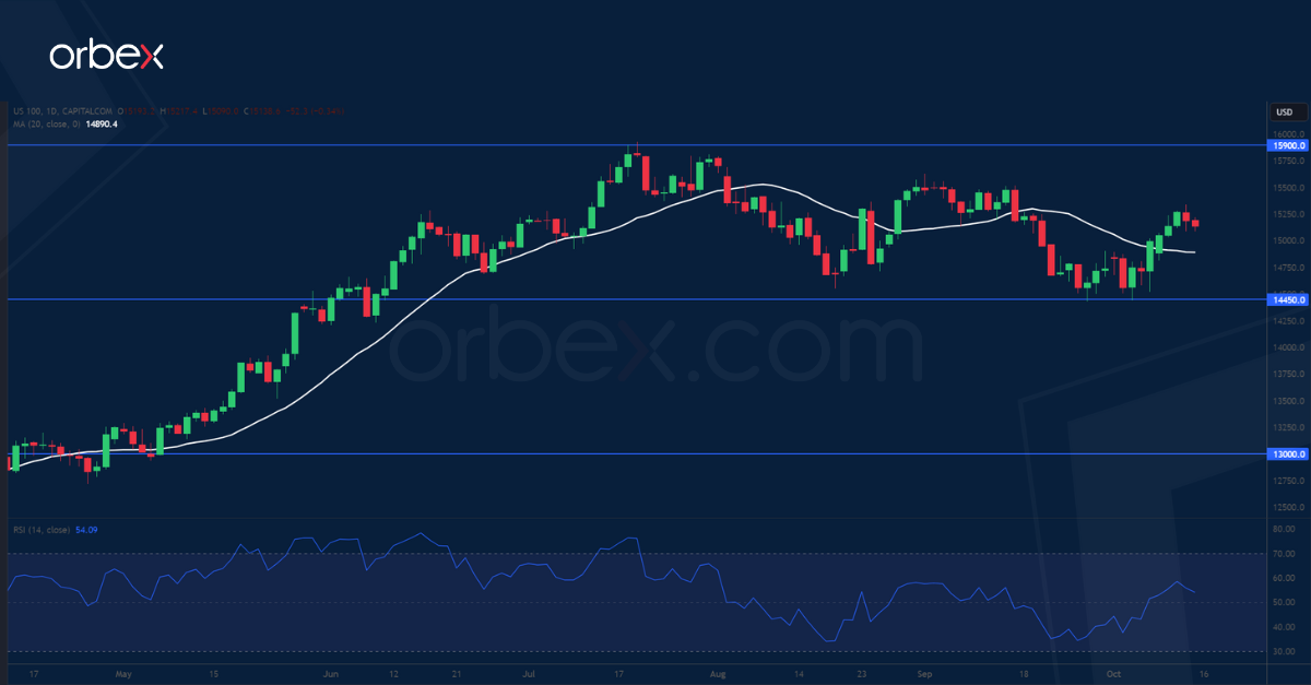 يرتفع مؤشر “ناسداك ١٠٠” على خلفية التصريحات الحذرة من قبل الاحتياطي الفيدرالي التي حفزت شهية المخاطرة. وقد دفع الانخفاض الأخير في عوائد السندات بعض رؤوس الأموال إلى العودة نحو الأصول مرتفعة المخاطر. إمكانية بقاء أسعار الفائدة دون تغيير حتى نهاية العام قد تقدم للمستثمرين إطاراً مستقراً وتجذب بعض راغبي الشراء بينما يقترب موسم إعلان الأرباح من بدايته. ومع ذلك، يراقب المشاركون في السوق بقلق الصراع بين إسرائيل وفلسطين حيث أن توسعه عبر المنطقة سيهدد الاستقرار العالمي الهش ويقوض التفاؤل بصناعة التكنولوجيا في إسرائيل. ويمثل المستوى ١٥٩٠٠ مقاومة رئيسية يتعين تجاوزها، فيما أصبح المستوى ١٤٤٥٠ دعماً جديداً.