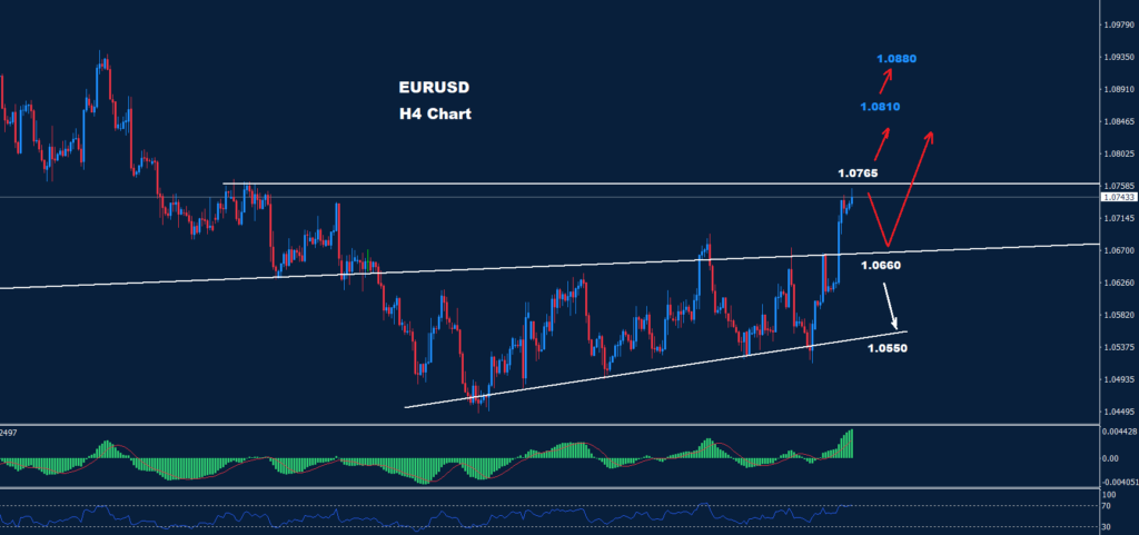 تمكن اليورو من اختراق المقاومة 1.0665 يوم الجمعة الماضي حيث تمكن السوق من إضافة المزيد من التقدم اليوم واقترب من المقاومة الثانية 1.0765 كما نصحنا الأسبوع الماضي.
