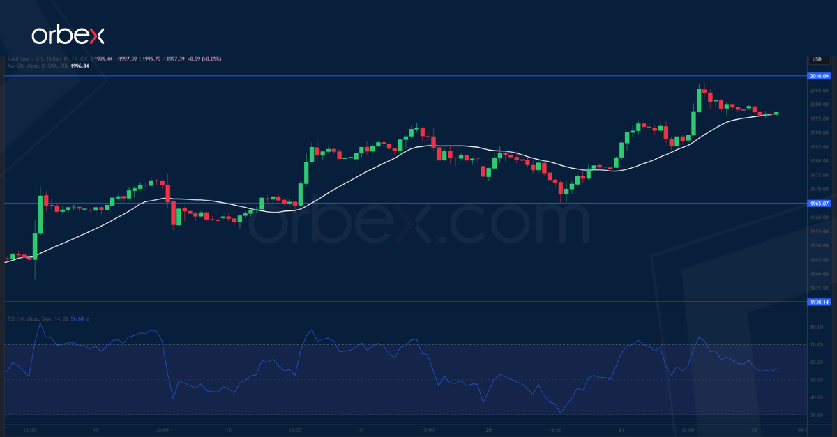 ارتفع سعر الذهب في أعقاب محضر اجتماع الاحتياطي الفيدرالي الذي أظهر ترددًا في رفع معدلات الفائدة بشكل إضافي. وبالإمكان توقع مواجهة مقاومة مع عودة الأسعار للارتفاع نحو آخر قمة ومنطقة العرض ٢٠١٠. والتي قد يجبر اختراقها ما تبقى من بائعين على تغطية مراكزهم، وهو الأمر الذي من شأنه أن يرسي الأساس للارتفاع نحو القمة القياسية ٢٠٨٠. بيد أن التوطيد المحدود قد يهبط بالأسعار دون ١٩٦٥ في حال قرر المشترون جني بعض الأرباح عند مستوى الدعم هذا. وإذا ما شهدت الأسعار مزيداً من التراجع، سيتعين صمود الدعم الرئيسي ١٩٣٠، للحفاظ على زخم الارتداد الحالي قائماً.