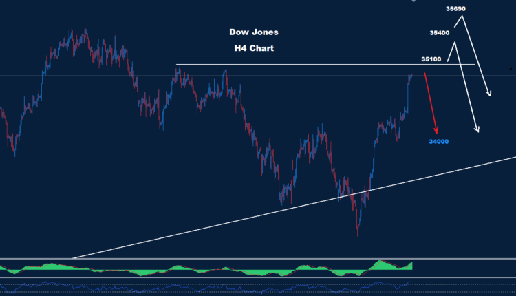 كما نرى بالرسم البياني أن مؤشر داو جونز يواجه عدة مستويات مقاومة حول 35100 و 35400 و35690 حيث قد تدفع إحدى تلك المقاومة نحو تصحيح هبوطي كبير نحو 34000.