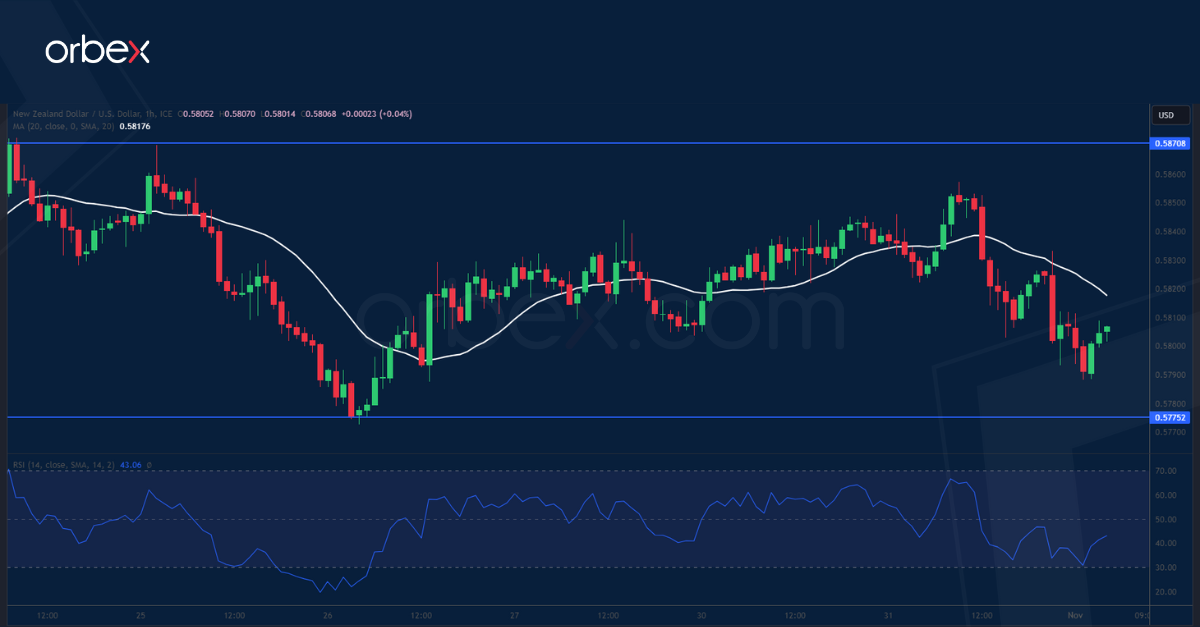تراجع الدولار النيوزيلندي مقابل نظيره الأمريكي بعد ارتفاع معدل البطالة في الربع الثالث. وقد تسبب جني البائعين لبعض الأرباح برفع سعر الصرف مؤقتاً. ويمثل مستوى ٠.٥٨٧٠ المجاور للمتوسط المتحرك البسيط على مدى ٢٠ يوماً أولى مستويات المقاومة التي لا بد من تجاوزها لتخفيف الضغط السلبي. وفي حال نجح الزوج بالارتفاع أكثر، سيمثل الدعم الذي تحول إلى مقاومة عند ٠.٥٩٥٠ بمثابة سقف رئيسي قد يترقبه البائعين للبيع بقوة ما دامت المعنويات العامة سلبية. أما القاع الأخير عند ٠.٥٧٧٥ فيمثل الدعم المباشر والذي من شأن كسره أن يشير إلى استمرار الاتجاه الهابط.