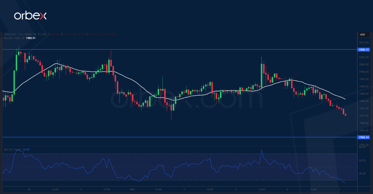 يتراجع الذهب تزامناً مع ارتفاع الدولار الأمريكي قبل خطاب جيروم باول المقرر يوم الأربعاء. بيد أن حركة التوطيد الأفقية الحالية، تمنح المشترين فرصة للاحتشاد من جديد فرصة للمضاربين على الارتفاع لالتقاط أنفاسهم بعد الارتفاع الحاد الشهر الماضي. ويعد التقاء القاع السابق ١٩٦٠، والمتوسط المتحرك البسيط لمدة ٢٠ يوماً مستوى رئيسياً لتوقع متابعة صفقات الشراء، حيث يشير ظل الشمعة السفلي إلى رفض العطاءات المنخفضة، مما يبقي السعر ثابتاً. ومن شأن الإغلاق أعلى ٢٠٠٨ أن يجذب متتبعي الاتجاه الذين يتطلعون للانضمام للمرحلة التالية من الصعود، مع استهداف المستوى ٢٠٥٠.