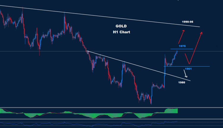 تمكن الذهب من الاحتفاظ بتداولاته تحت مستوى المقاومة 1975 حيث تمكن من ضرب تصحيح هبوطي نحو مستويات 1961 وما دونه.