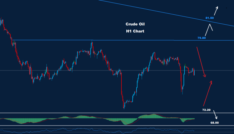 تمكن النفط الخام من الصمود في التداولات تحت مستوى المقاومة 79.70 حيث تمكن من تحقيق حركة هبوطية أخرى نحو مستوى 73.80.