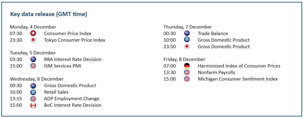 يرتفع سعر صرف الدولار الأسترالي مقابل نظيره الأمريكي فيما يتوقع أن يبقي الاحتياطي الأسترالي على سياسة نقدية متشددة وسط استمرار التضخم المرتفع. وكانت أسعار البضائع قد تباطأت بأكثر من المتوقع في شهر أكتوبر نتيجة انخفاض في أسعار البنزين وتكاليف الإيجار والسفر، مما قلل من الضغط على البنك الاحتياطي الأسترالي ليترك السوق مع مفاجأة رفع أسعار الفائدة في عيد الميلاد. بيد أن تضخم الخدمات ظل مرتفعاً، وقد يرى صانعو السياسات أنه لا يزال هناك قدر كبير من المرونة في الاقتصاد. ويسعر المشاركين في السوق ارتفاع آخر لأسعار الفائدة في أوائل العام المقبل، ويمكن أن تدفع التوجيهات القوية من قبل البنك المركزي هذا الأسبوع سعر الصرف نحو ٠.٦٩٠٠، مع عمل ٠.٦٤٦٠ كمستوى دعم أول.