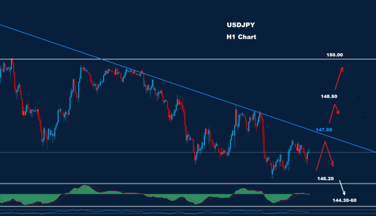 كما نرى على الرسم البياني، يواجه السوق مقاومة للترند الهابط حول 147.60 بينما يقع الدعم حول 146.20.