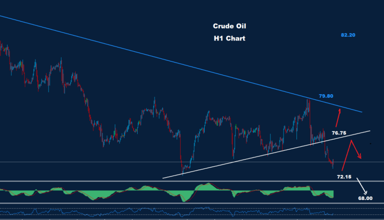تمكن النفط الخام من تحقيق موجة هبوط أخرى بعد اختبار المقاومة 79.80، حيث تمكن من الاقتراب مرة أخرى من الدعم الأساسي 72.15.