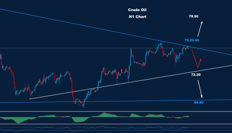 تمكن النفط الخام من الحفاظ على تداولاته فوق الدعم 72.20، حيث تمكن من إضافة المزيد من التقدم نحو المنطقة المستهدفة 50-75.20 كما توقعنا في وقت سابق من هذا الأسبوع قبل أن يحافظ السوق على تداولاته ضمن منطقة التداول هذه.