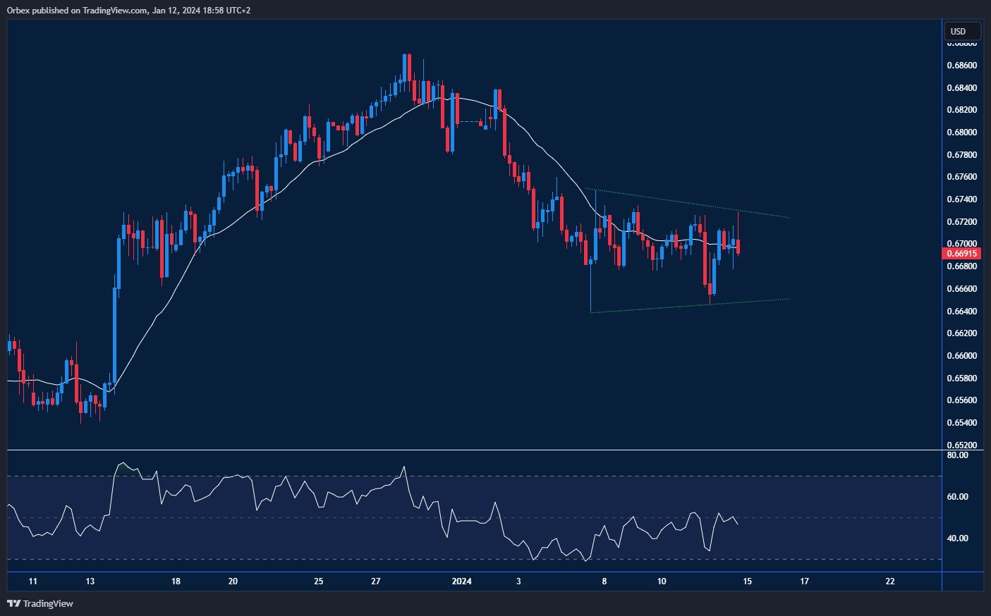 تعافى الدولار الأسترالي مقابل نظيره الأمريكي بفضل تحسن الرغبة في المخاطرة. وقد بدأ العام الجديد مع استعداد ملحوظ للمستثمرين في تحمل مزيد من المخاطر، وقد ساهم تحسن المعنويات العامة الطفيف في تحديد سياق إيجابي للحركة المقبلة. وكون الدولار الأسترالي يعتبر مؤشر لثاني أكبر اقتصاد في العالم، يستفيد الدولار الأسترالي من التفاؤل بشأن تحسن الاقتصاد الصيني. ويتجه الزوج نحو مثلث متماثل يتطلع لاختراق مستوى ٠.٦٧. ويتطلب المزيد من الارتفاع تجاوز مستوى ٠.٦٧٨٠ قبل اختبار آخر لأعلى مستوى شهري عند ٠.٦٨٦٠.